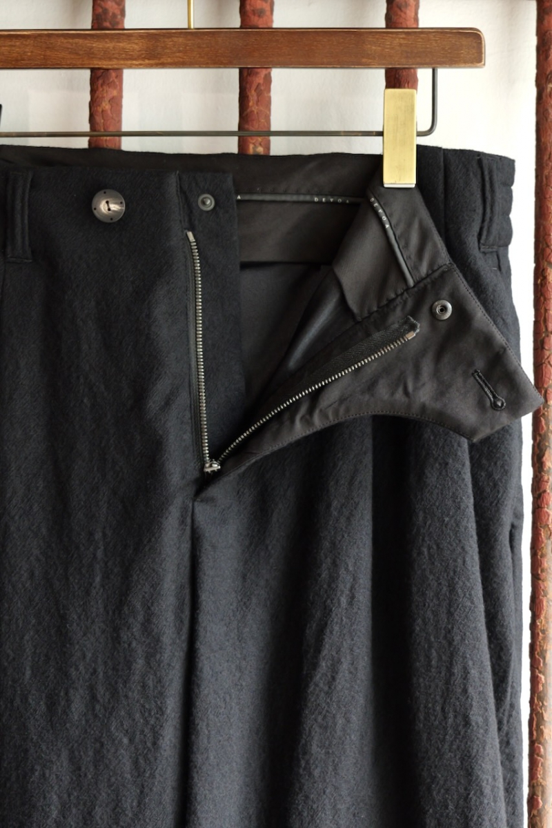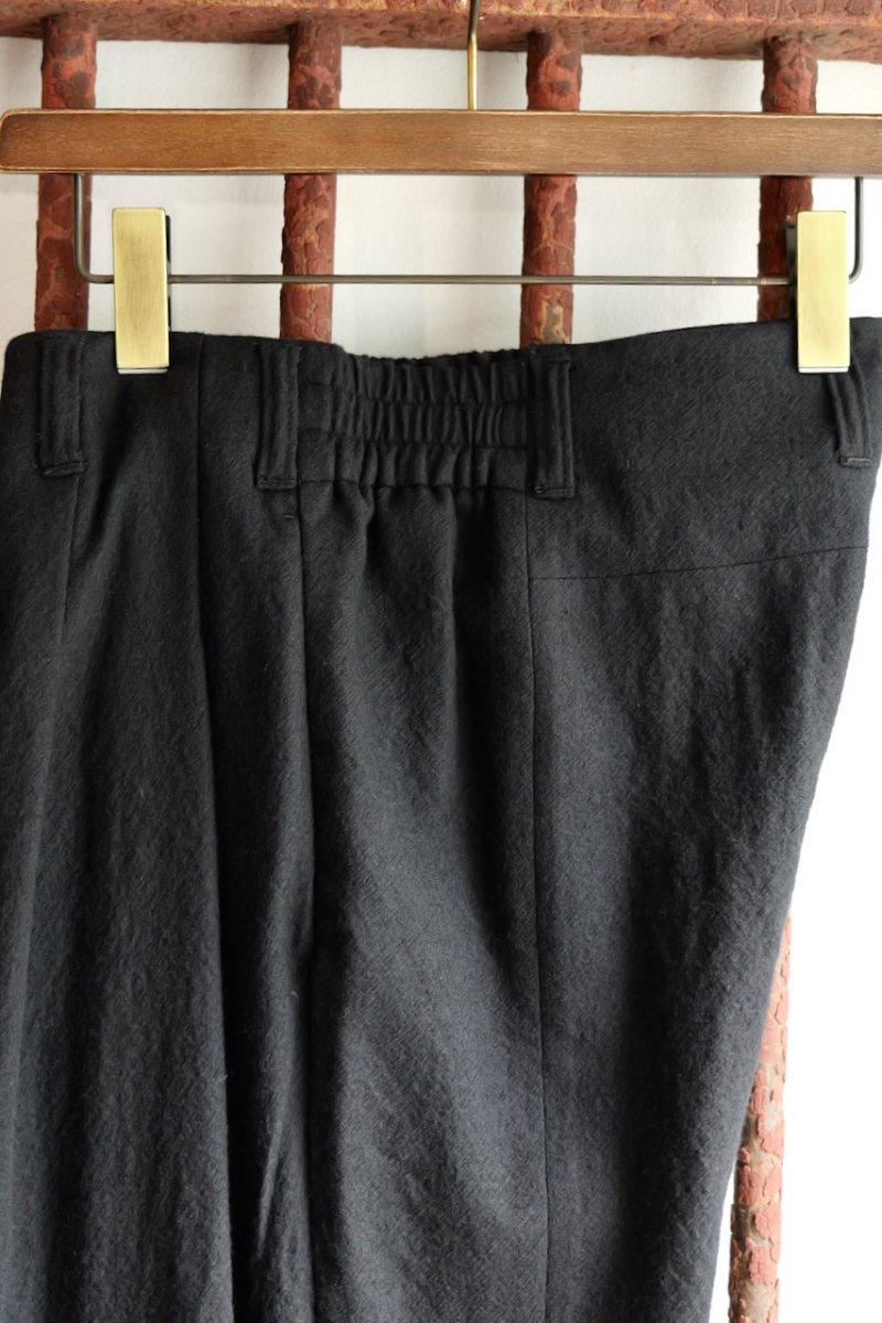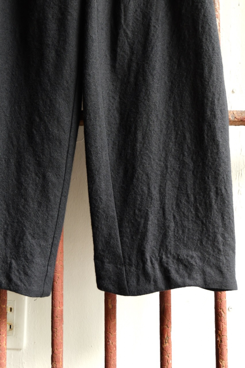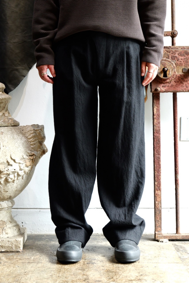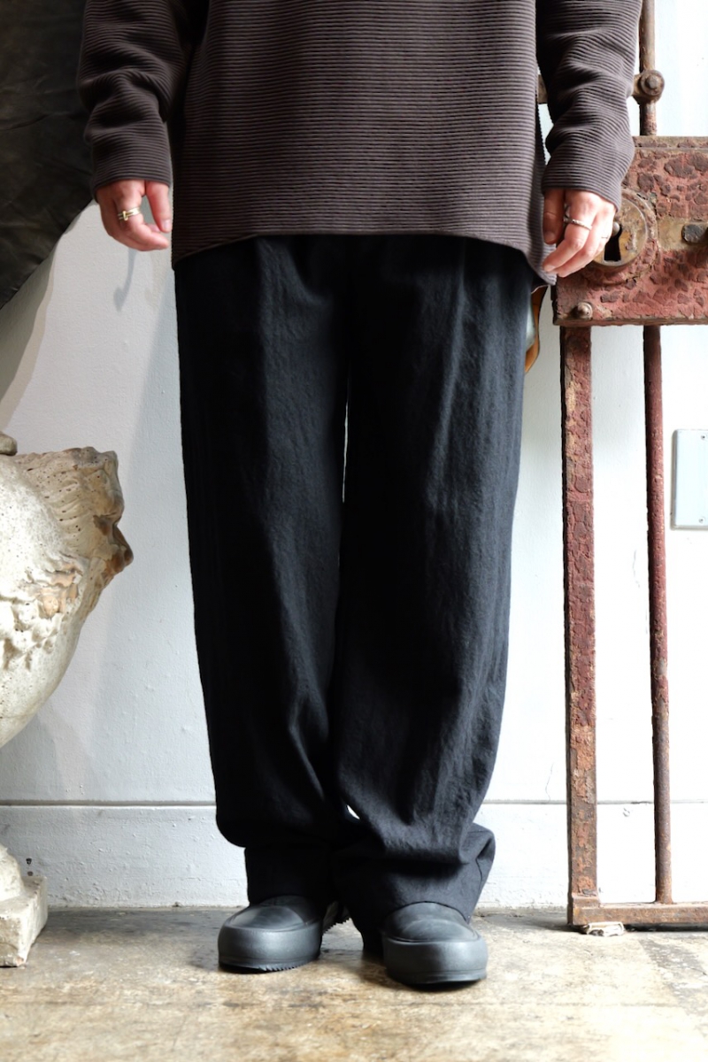 ・腰回りをすっきりとさせ、膝下にゆとりを持たせたバギーシルエットのパンツ。