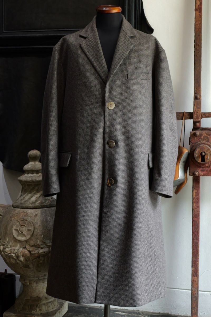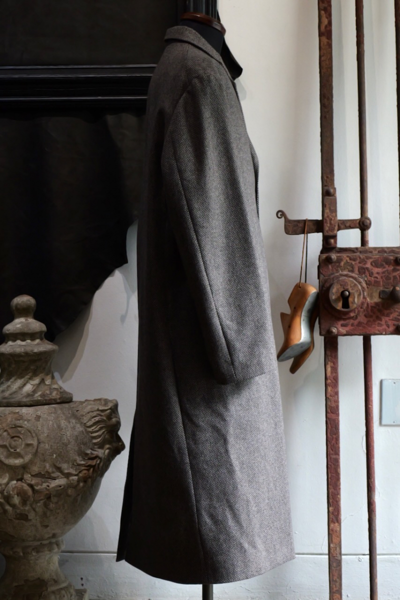 ・チェスターコートのようにテーラードな襟、シングルブレストのクラシックなロングコート。